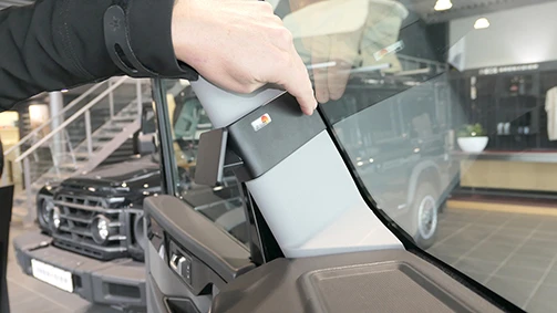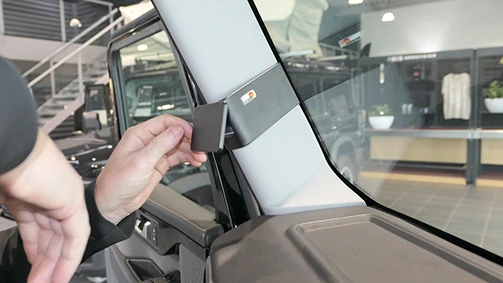 Use the enclosed alcohol pad to clean the area where the mount is to be installed. Peel off the adhesive tape cover. Pull out the rubber sealent on the A-post. Press the lower part of the mount into the gap and hook it behind the A-post.