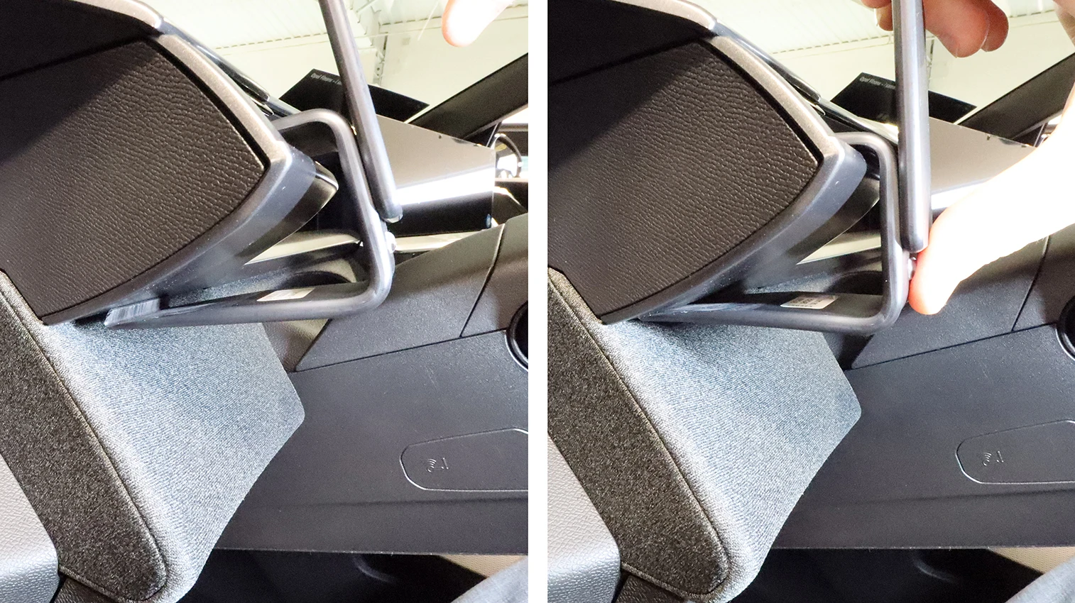 Press the lower edge of the mount downward and forward. Press forward on the lower part of the mount so the lower edge hooks between the dashboard sections.
