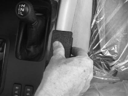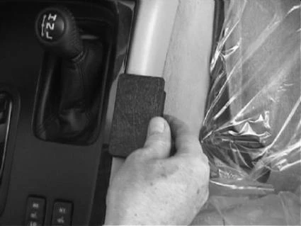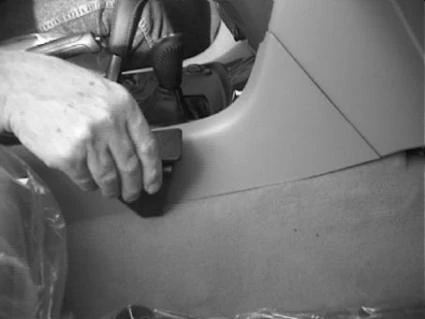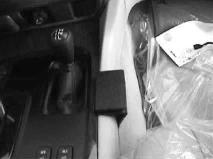 Peel off the cover of adhesive tape on the ProClip. Hook the angled edge on the right side of the ProClip under the console frame edge by the floor.
