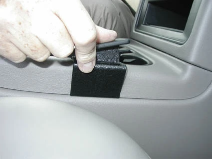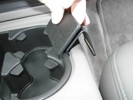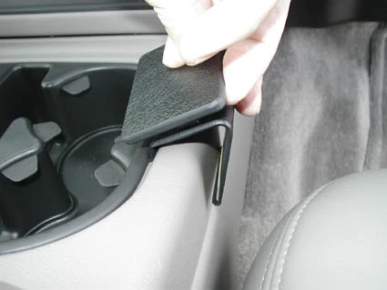 Peel off the cover of the adhesive tape on the ProClip. Press the curved edge on the left side of the ProClip into the gap between the cup holder frame and the console edge.