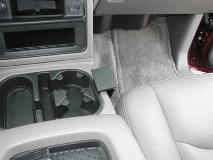 Press firmly down on the right side of the ProClip, towards the floor, so the angled edge snaps into the gap in the floor console sidewall.