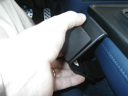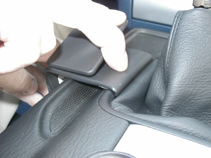 Peel off the cover of the adhesive tape on the ProClip. Hook the angled edge on the lower left side of the ProClip under the leather console edge by the carpet.