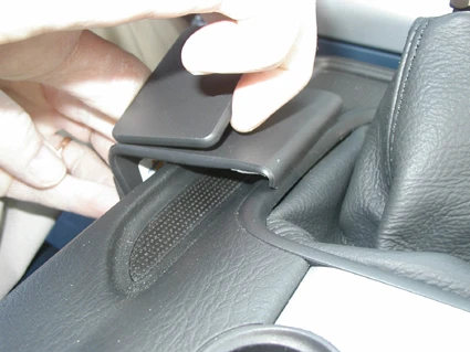 Hook the angled edge on the right side of the ProClip over the console edge surrounding the gear shift rubber boot.