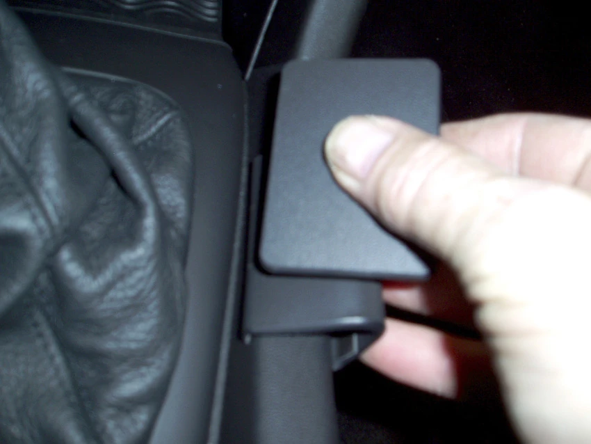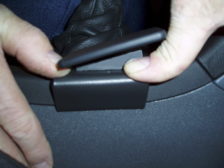 Peel off the adhesive tape covers on the ProClip. Hook the left part of the ProClip over the edge of the console frame.