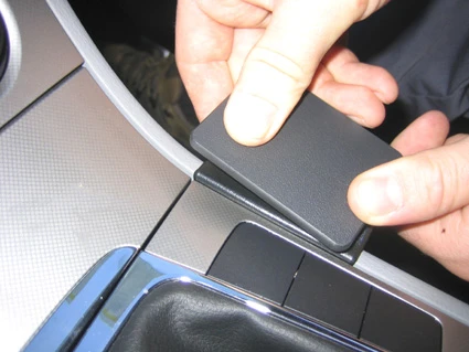 Peel off the adhesive tape covers on the ProClip. Press the angled edge on the left side of the ProClip into the gap between the panel surrounding the gear shift and the edge of the console.
