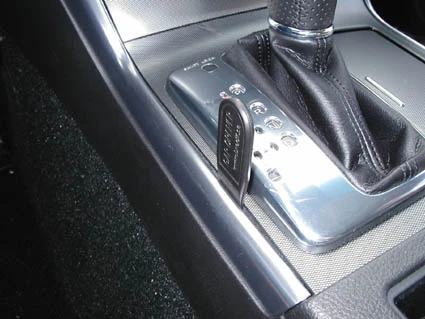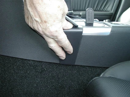 Press firmly down on the left side of the ProClip so the angled edge hooks over the console edge by the carpet. Press until you see or hear/feel it snaps into place. Pull out the gap opener.