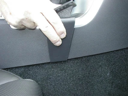 Press firmly down on the right side of the ProClip so the angled edge hooks over the console edge by the carpet. Press until you see or hear/feel it snaps into place. Pull out the gap opener.