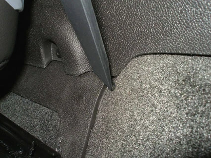 Peel off the cover of adhesive tape on the ProClip. Hook and slide the angled edge under the console edge by the carpet.