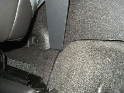 Hook and slide the angled edge under the console edge by the carpet.