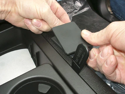 Press the thin end of the enclosed gap opener into the gap between center console and the console edge, to widen the gap. Place your index fingers under the ProClip and pull upwards and hook the angled egde over the console edge and into the gap next to the gap opener. Pull out the gap opener.