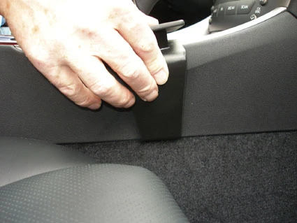 Press the lower right side of the ProClip towards the sidewall with your index finger to make sure the angled edge is properly hooked underneath the console edge.