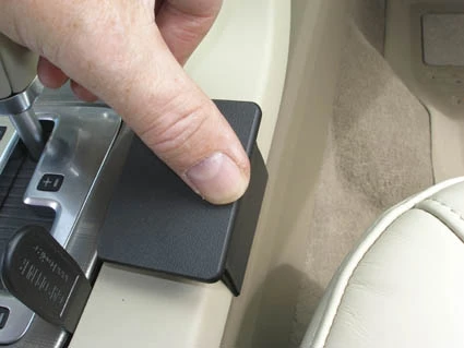 Use the enclosed alcohol pad to clean the area where the ProClip is to be installed. Press the thin end of the enclosed gap opener into the gap between the panel surrounding the gear shift and the console, to widen the gap. Peel off the adhesive tape covers on the ProClip.