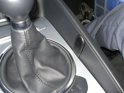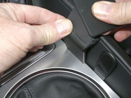 Press the thin end of the enclosed gap opener into the gap between the panel surrounding the gear shift and the floor console frame, to widen the gap.