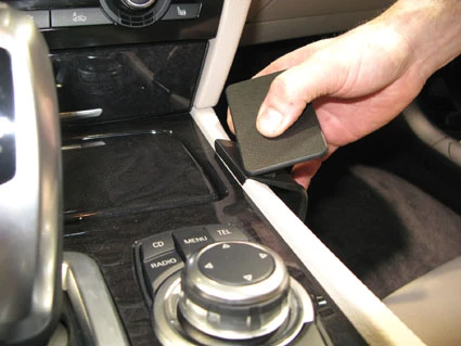 Use the enclosed alcohol pad to clean the area where the ProClip is to be installed. Peel off the adhesive tape cover on the ProClip. Place the angled edge on the left part of the ProClip over the edge of the console.