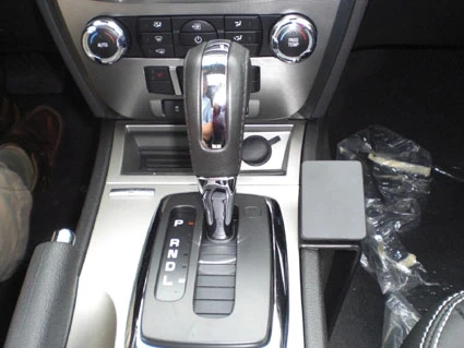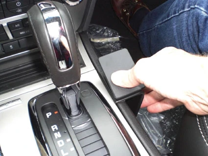 Use the enclosed alcohol pad to clean the area where the ProClip is to be installed. Peel off the cover of adhesive tape on the ProClip. Press the angled edge on the left side of the ProClip into the gap between the center panel and the console edge.