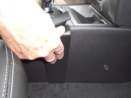 Press firmly down on top of the right side of the ProClip so the angled edge hooks around the console sidewall edge by the carpet. Press until you see or hear/feel it click into place.