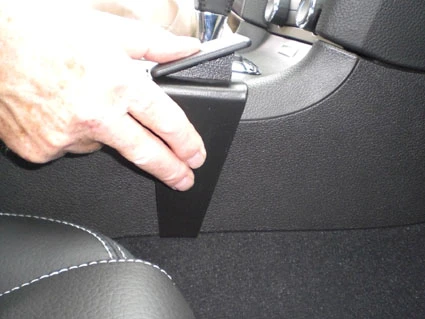 Press firmly down on top of the right side of the ProClip so the angled edge hooks around the console sidewall edge by the carpet. Press until you see or hear/feel it click into place.