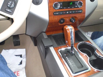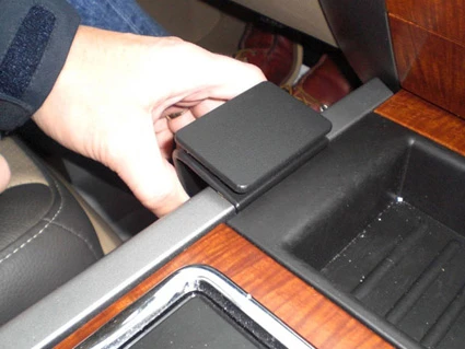 Press firmly down on the top left side of the ProClip so the angled edge clips/hooks into the seam/gap in the console sidewall.