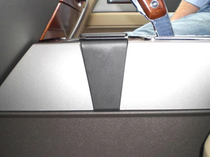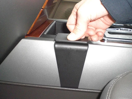 Use the enclosed alcohol pad to clean the area where the ProClip is to be installed. Peel off the cover of adhesive tape on the ProClip. Press/Hook the angled edge on the right side of the ProClip into the seam/gap between the console edge and the coin box.