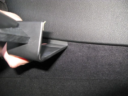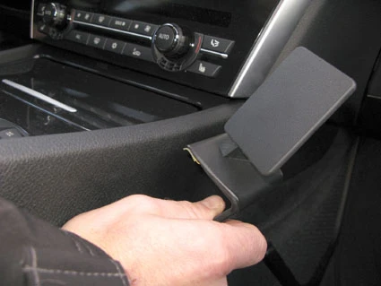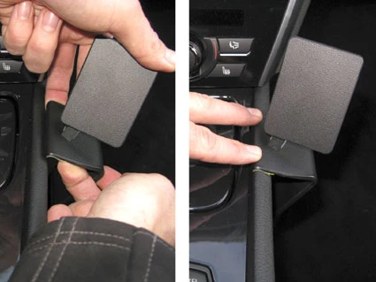 Pull the upper part of the ProClip upward and hook the angled left edge over the edge of the console. Press down on the left part of the ProClip so the adhesive tape attaches.