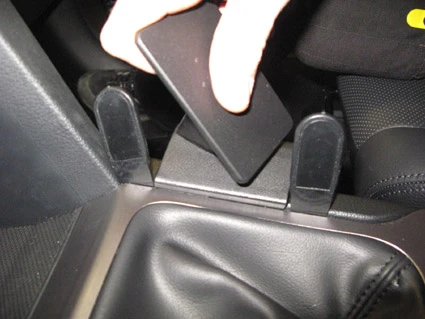 Use the enclosed alcohol pad to clean the area where the ProClip is to be installed. Press the thin end of the enclosed gap openers into the gap between the console panel and the console edge, to widen the gap. Peel off the adhesive tape cover on the ProClip. Press the angled edge on the left part of the ProClip into the gap between the gap openers.