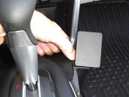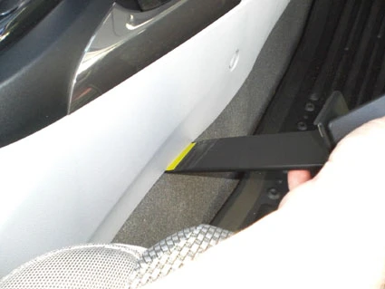 Use the enclosed alcohol pad to clean the area where the ProClip is to be installed. Press the thin end of the enclosed gap opener into the seam/gap between the console edge and the center panel, to widen the gap. Peel off the cover of adhesive tape on the ProClip. Press/hook the angled edge on the lower part of the ProClip around the console sidewall edge by the carpet.