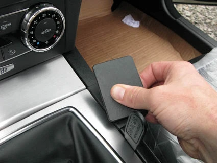 Use the enclosed alcohol pad to clean the area where the ProClip is to be installed. Press the thin end of the enclosed gap opener into the gap between the edge of the console and the panel surrounding the gear shift. Peel off the adhesive tape cover on the ProClip.