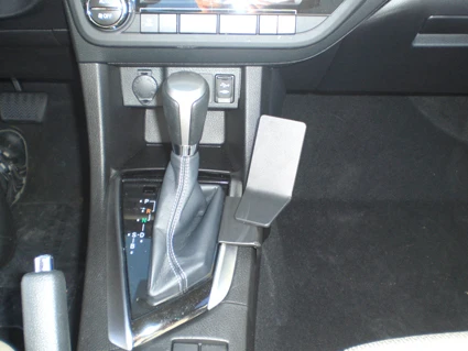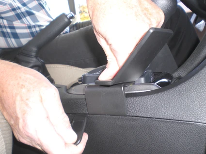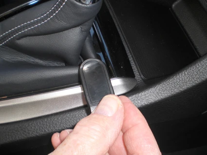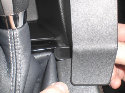Use the enclosed alcohol pad to clean the area where the ProClip is to be installed. Peel off the adhesive tape cover on the ProClip. Press/hook the angled edge on the left side of the ProClip into the seam between the shifter frame and the floor console upper panel edge in front of the gap opener.