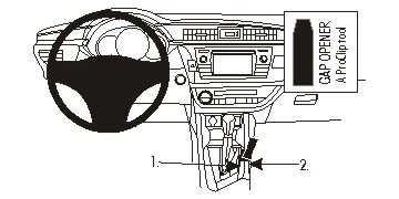 Press the thin end of the gap opener info the gap in the console sidewall next to the ProClip, to widen the gap. Press down on the top right side of the ProClip so it flexes downward. The lower angled edge on the ProClip should hook into the gap next to the gap opener. Pull out the gap opener.