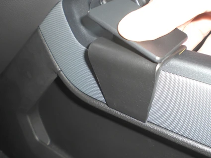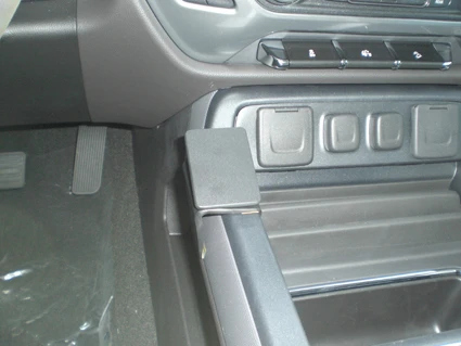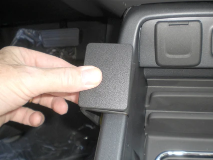 Use the enclosed alcohol pad to clean the area where the ProClip is to be installed. Peel off the adhesive tape cover on the ProClip. Place the angled edge on the right side of the ProClip over the console edge.