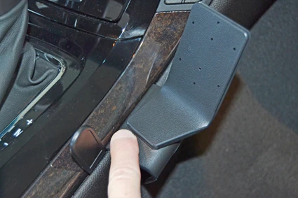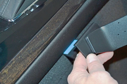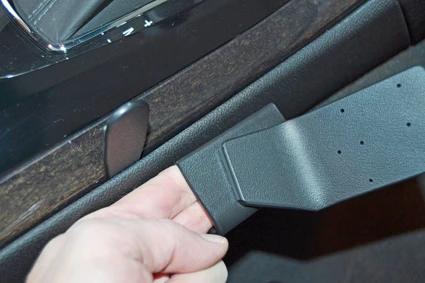 Use the enclosed alcohol pad to clean the area where the ProClip is installed. Peel off the adhesive tape cover on the ProClip. Hook the lower angled edge of the ProClip under the console right side panel by the carpet.