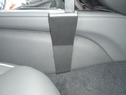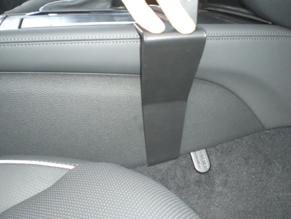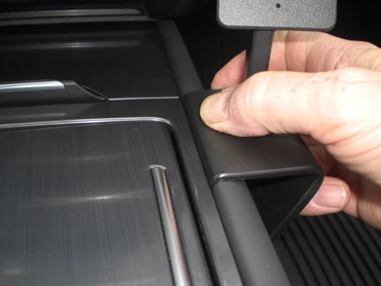 Use the enclosed alcohol pad to clean the area where the ProClip is to be installed. Remove the adhesive tape cover on the ProClip. Press the angled edge on the left side of the ProClip into the gap between the console edge and the center console panel.