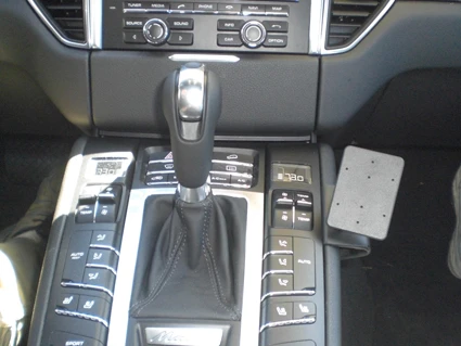 Use the enclosed alcohol pad to clean the area where the ProClip is to be installed. Peel of the adhesive tape cover on the ProClip. Press the thin end of the enclosed gap opener into the gap between the console edge and the center console panel. Then press the angled edge on the left side of the ProClip into the gap in front of the gap opener. Remove the gap opener.