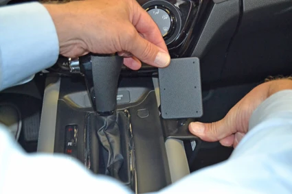 Press the right side of the ProClip downward so the angled right edge hooks around the center console edge. Remove the gap opener.