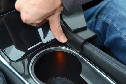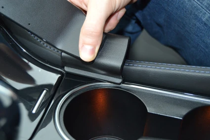 Use the enclosed alcohol pad to clean the area where the ProClip is to be installed. Remove the adhesive tape cover on the ProClip. Press the thin left edge of the ProClip into the gap between the console sidewall and the frame surrounding the cup holder.
