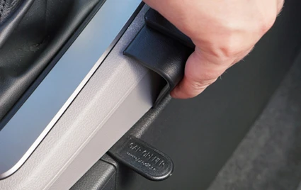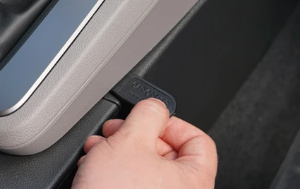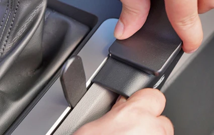 Use the enclosed alcohol pad to clean the area where the ProClip is to be installed. Remove the adhevise tape cover on the ProClip. Press the thin end of the enclosed gap opener into the seam between lower console sidewall and the upper console side wall, to widen the gap.