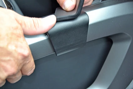 Use the enclosed alcohol pad to clean the area where the ProClip will attach. Remove the adhesive tape cover on the ProClip. Hook the upper left edge of the ProClip over the left edge of the top of the right console side panel.