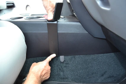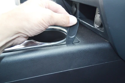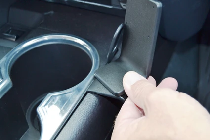 Use the enclosed alcohol pad to clean the area where the ProClip is to be installed. Press the thin end of the enclosed gap opener into the gap between the frame surrounding the cup holder and the console. Peel off the adhesive tape cover on the ProClip.