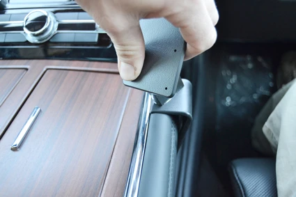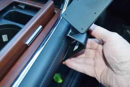 Lift the left edge of the ProClip over the top of the console edge. Hook/Press the upper edge of the ProClip into the gap between the padded console and the console trim.