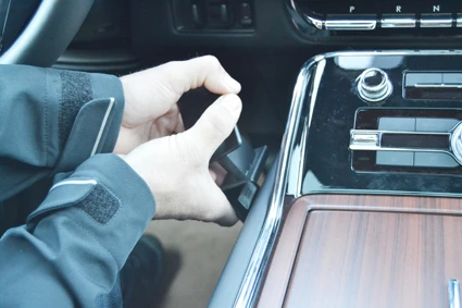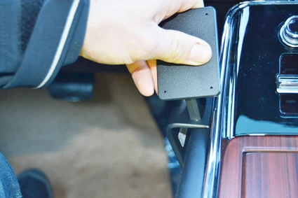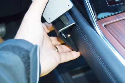 Lift the right edge of the ProClip over the top of the console edge. Hook the upper edge of the ProClip into the gap between the padded console and the console trim.