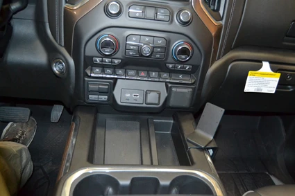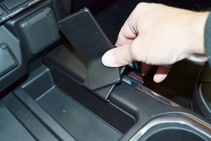 Press downwards on the right side of the ProClip. At the same time, press the right part of the ProClip toward the sidewall and hook the lower edge of the ProClip under the floor console.