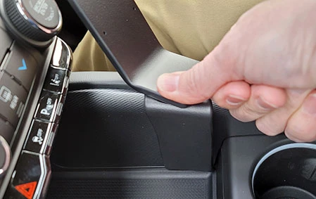 Press downward on the ProClip so the lower edge hooks/snaps into place under the floor console inner sidewall.