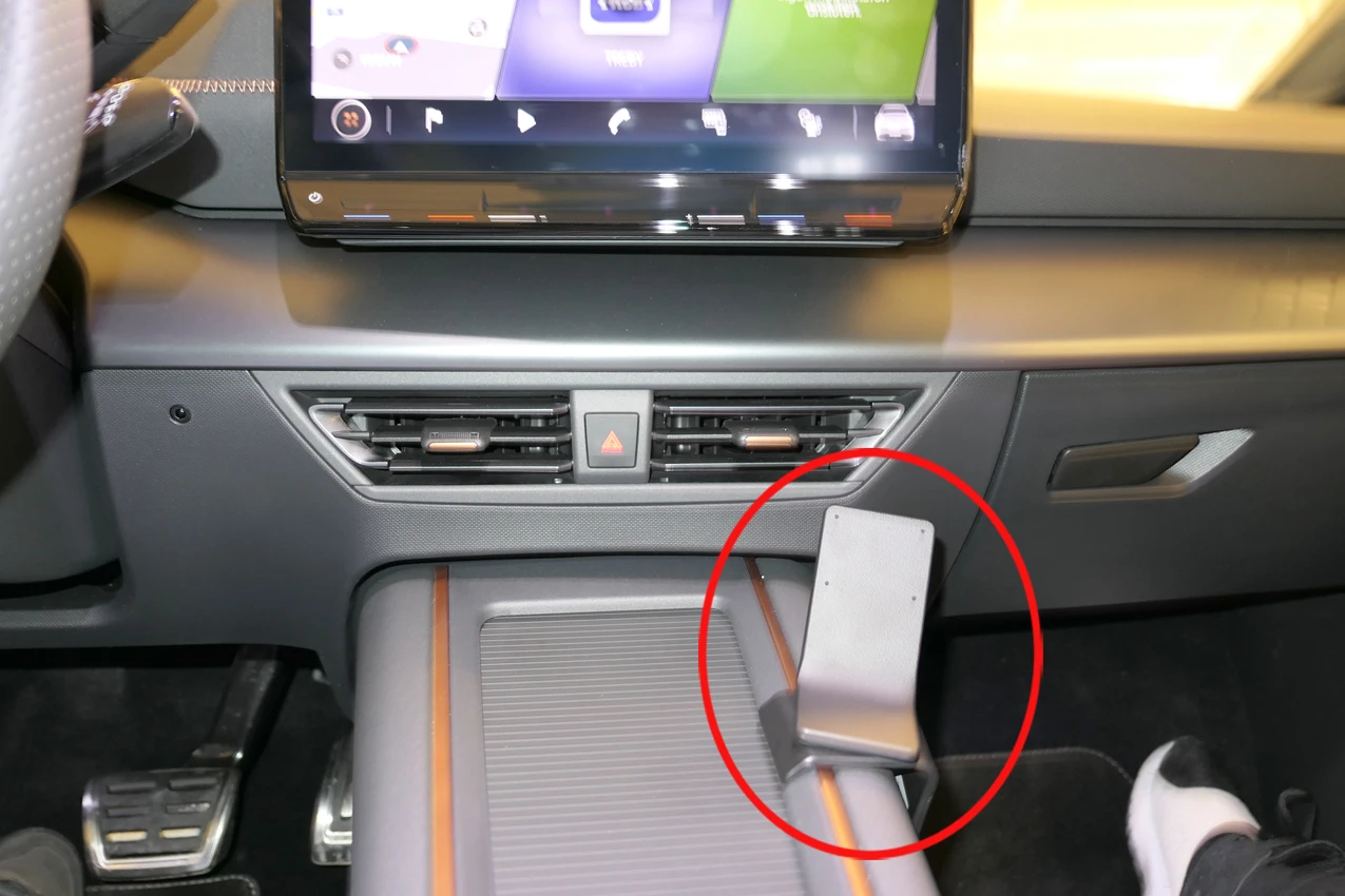 Press the lower edge of the ProClip into the gap, at the same time press/flip the upper part of the ProClip upward so the curved lower edge hooks behind the center console sidewall.