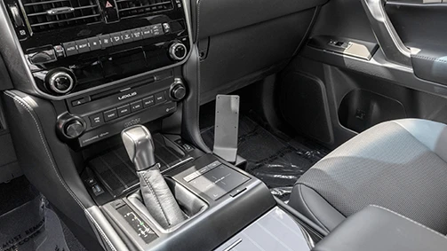 Use the enclosed alcohol pad to clean the area where the mount is to be installed. Peel off the adhesive tape cover. Hook the left part of the mount over the center console frame.