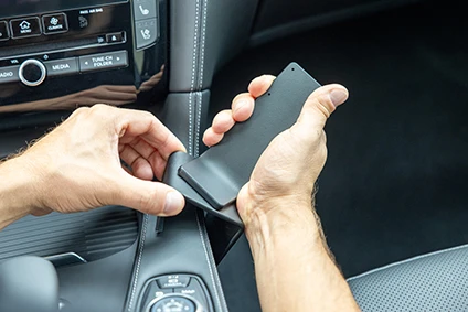 Hook the angled edge over the padded console frame. Press the upper and lower edges of the mount toward the center console so they are properly in place.