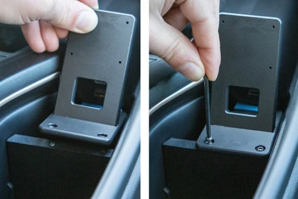 Hook the face plate part of the mount under the USB ports frame. Attach the face plate onto the devider block with the enclosed screws.