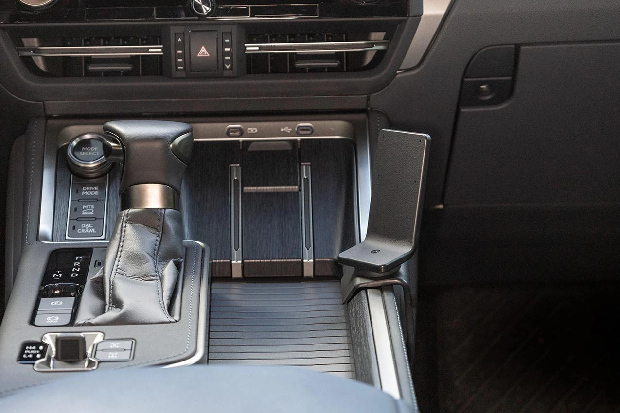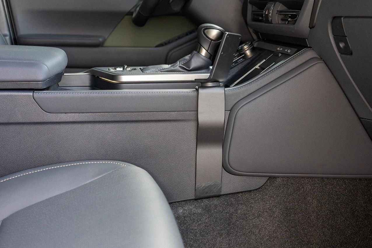 Use the enclosed alcohol pad to clean the area where the mount will be installed. Peel off the adhesive tape cover. Hook the lower edge of the mount under the edge of the console sidewall.