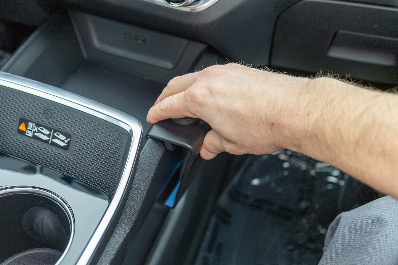 Use the enclosed alcohol pad to clean the area where the mount will be installed. Peel off the adhesive tape cover. Hook the upper edge of the mount into the gap between the compartment wall and the console trim.