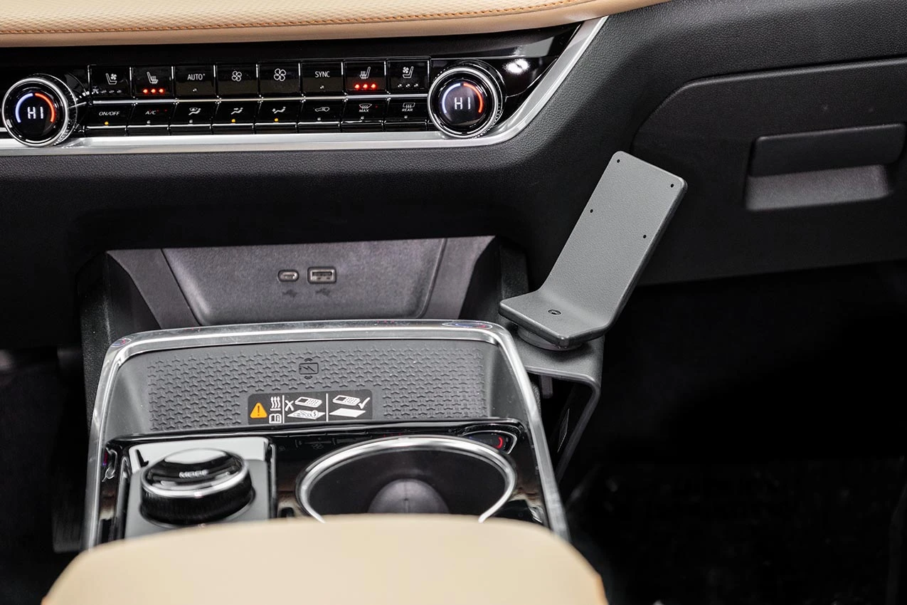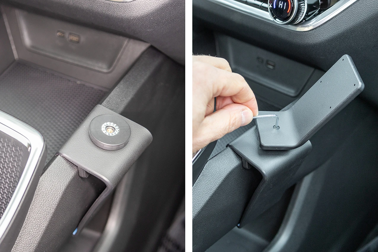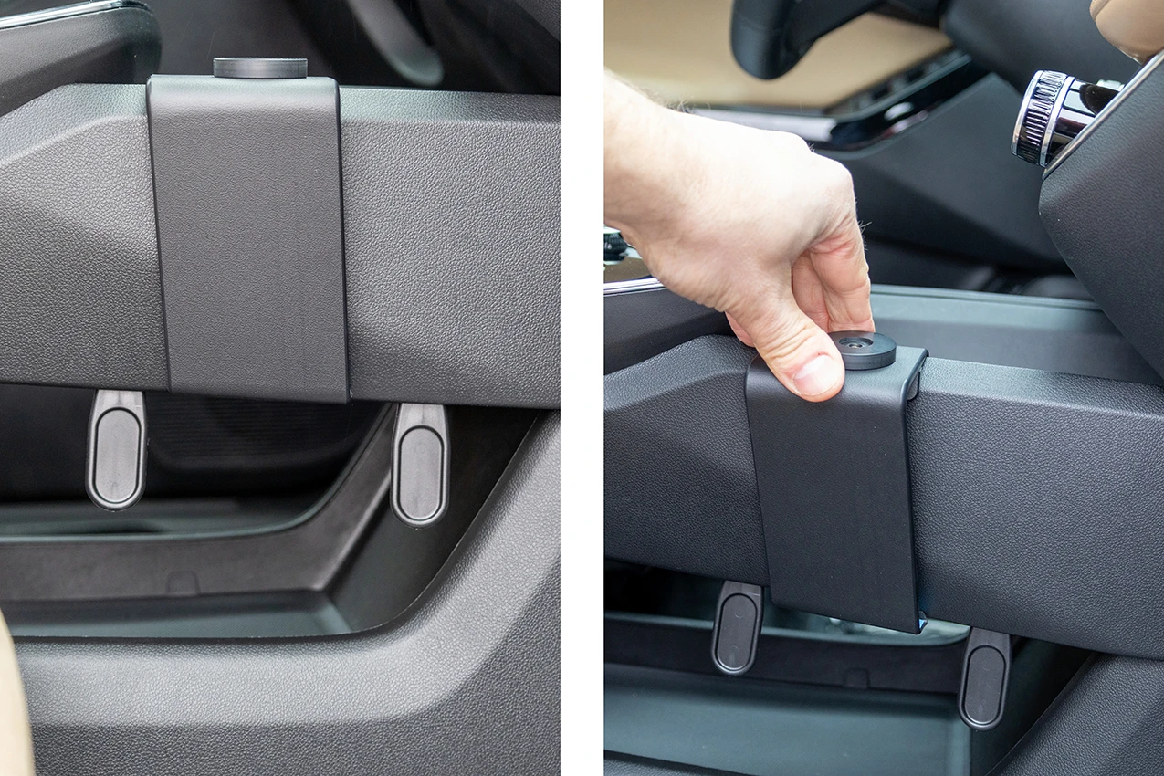 Insert the included gap openers into the gap under the console side panel, one on each side of the mount. Press down on the top of the mount until the lower edge hooks/clips into the gap between the gap openers. Pull out the gap openers.