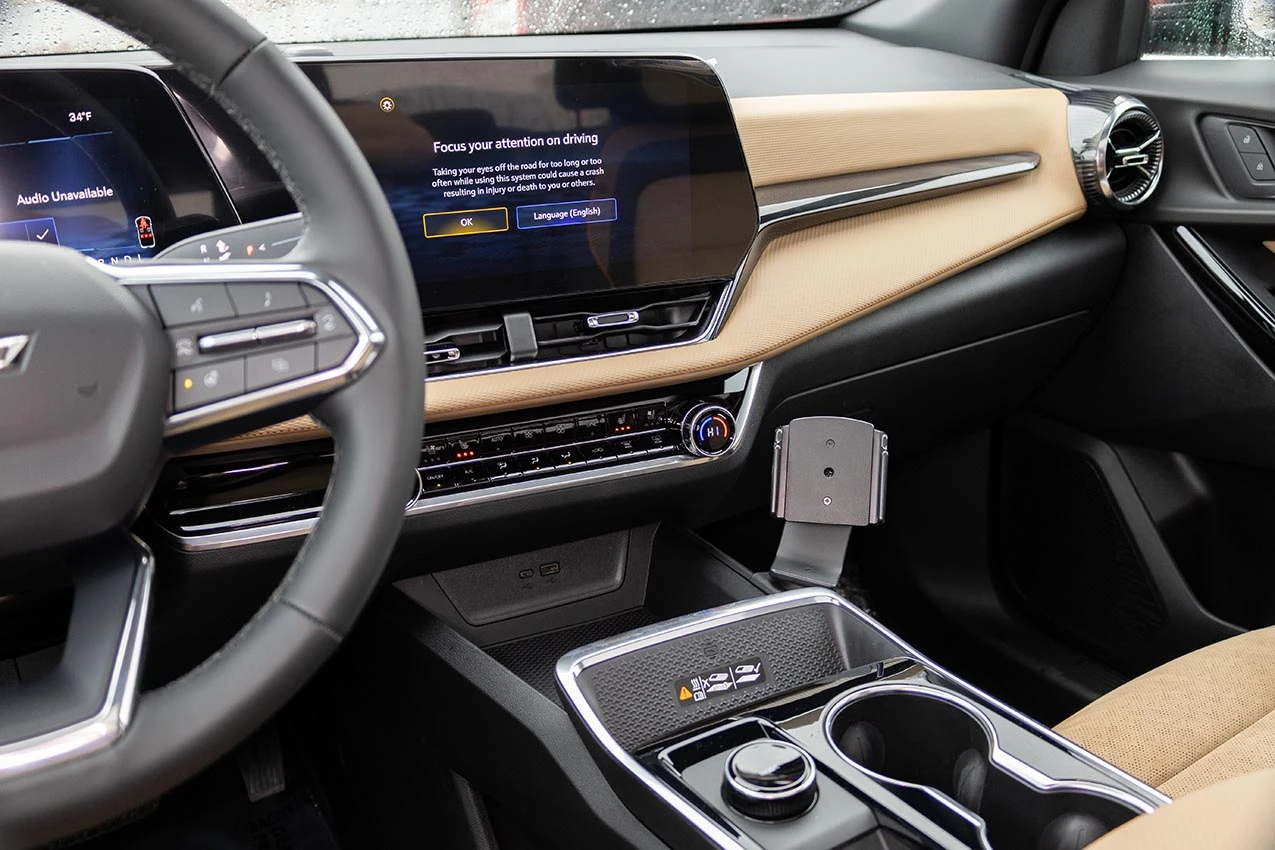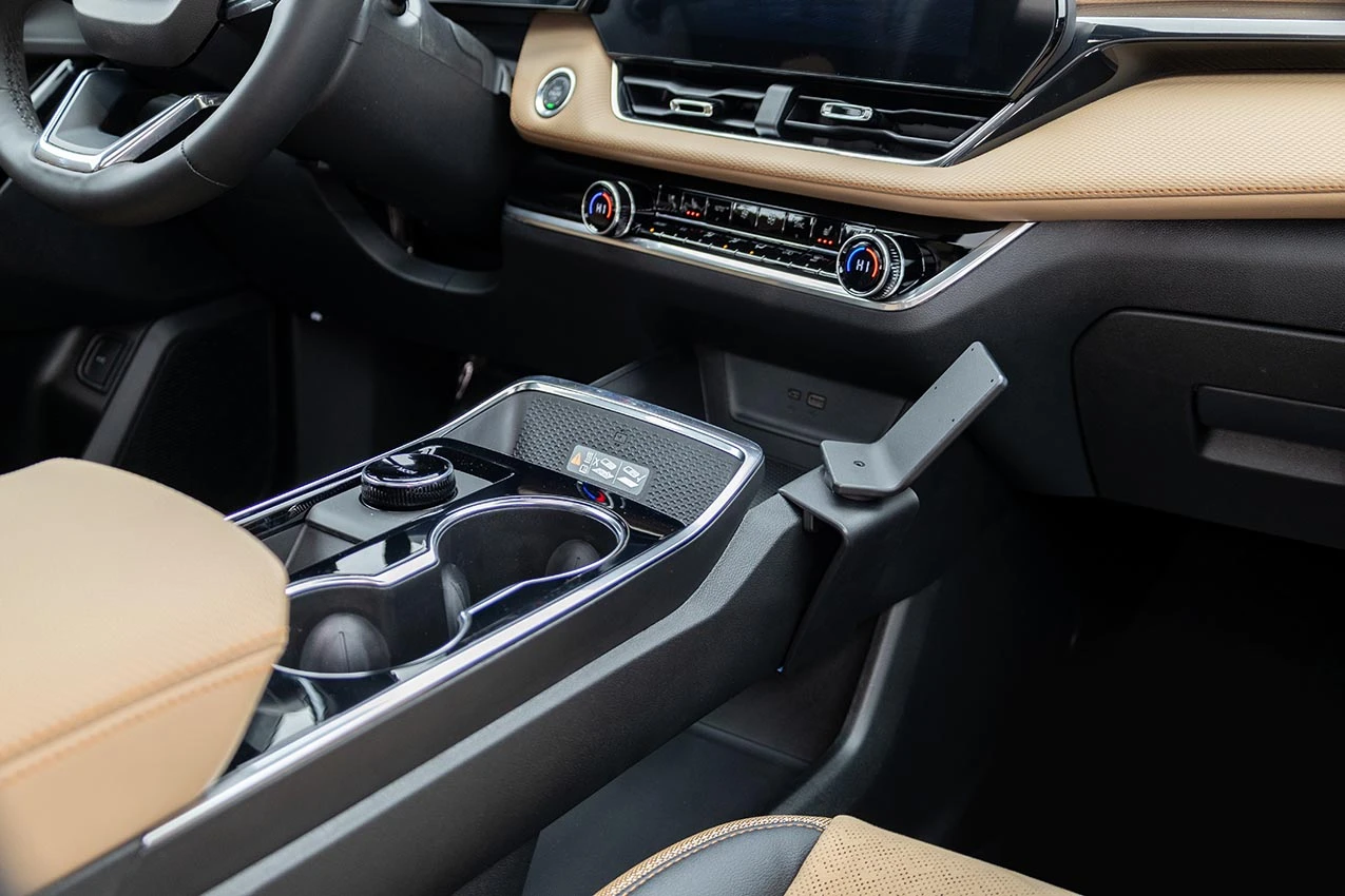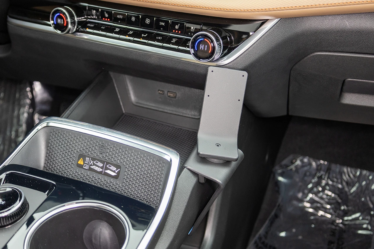 Insert the included gap openers into the gap under the console side panel, one on each side of the mount. Press down on the top of the mount until the lower edge hooks/clips into the gap between the gap openers. Pull out the gap openers.
